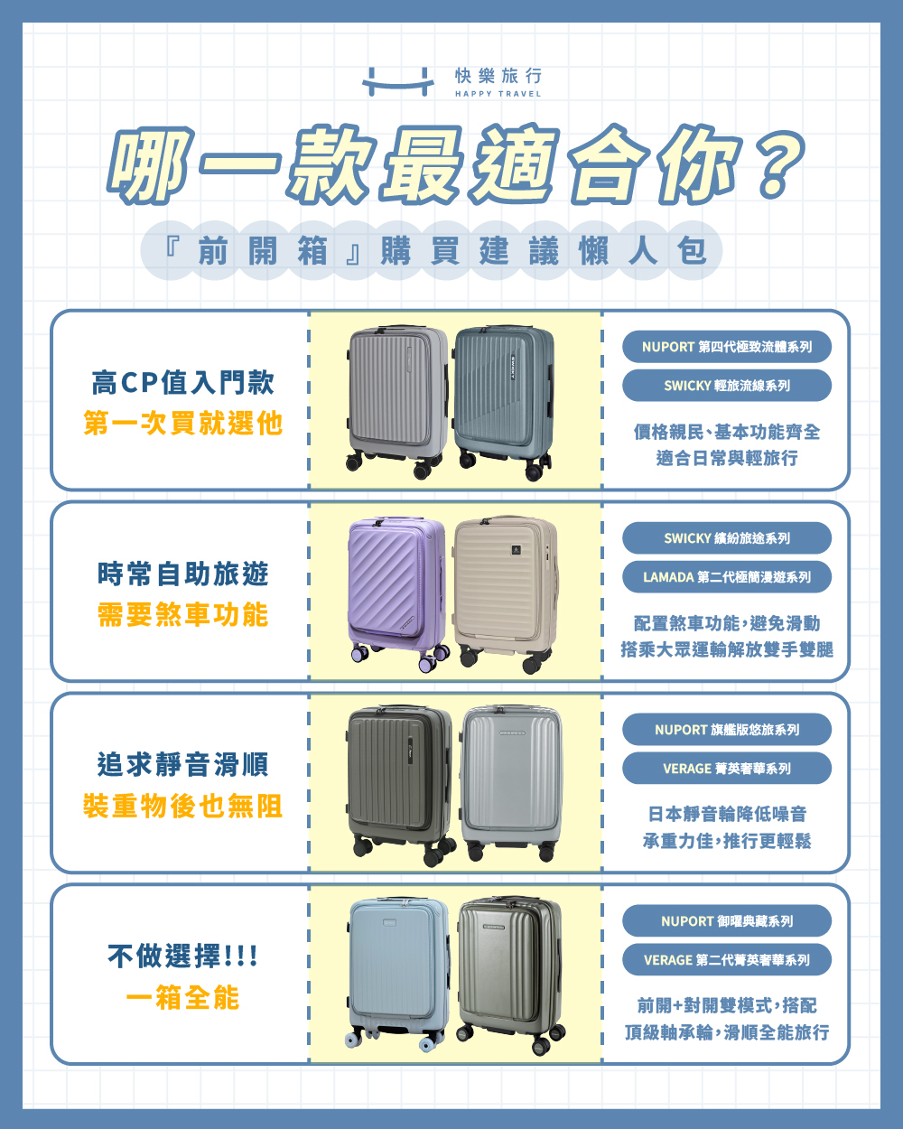 出國買行李箱不知道從哪選起?快樂旅行整理前開箱4大類型,從高CP值入門款、煞車功能、日本靜音輪到前開對開全能款,一次找到最適合你的那一個。