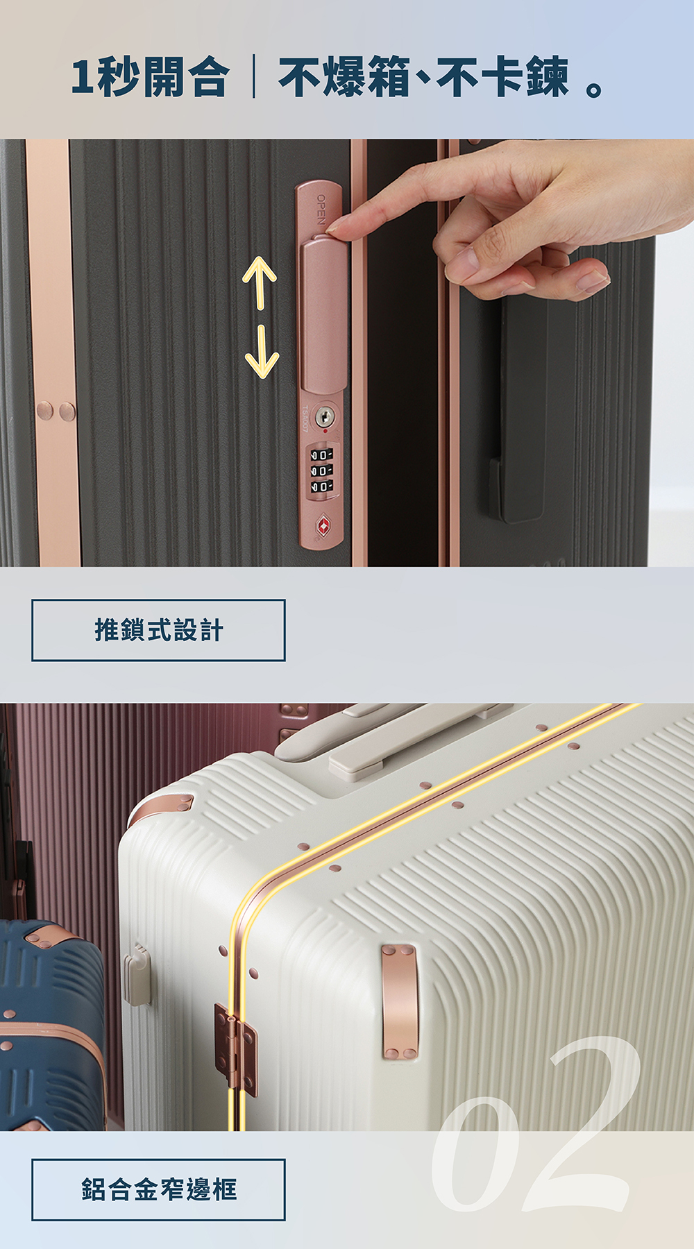 ● 推鎖式設計,1秒開合,不爆箱、不卡鍊